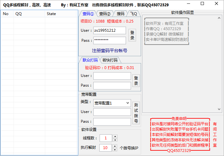 增加了多个解封平台,支持宽带拨号换IP,多线程解封被冻结的QQ