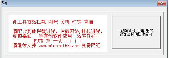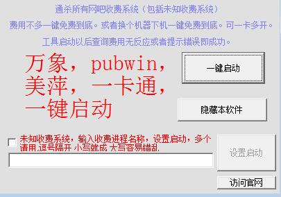 该软件轻松破解万象,PUBWIN,一卡通等 考虑到全国各地网吧收费系统的杂乱,设置了未知收费系统,只需要通过任务管理器查找到收费端的名称,依然可以破解 该版本修改了隐藏窗体,修改了 关键词隐藏 解决部分网吧屏蔽,换了新壳 更换 了特征码 防打不开 自己试试吧 未知进程 请填写到进程列表 中 小写就可以了 考虑到破解后 机子突然关机,另附有效的拦截网吧关机软件,该软件非常好用,效果强大。 建议破解后再用该软件拦截关机和重启。以防万一 又考虑到一些比较特殊的收费系统,特此加了这个版本针对一卡通系统。本工具不注入钩子,解决破解后玩不了游戏的弊端。 下载之前请先考虑到:会被网管打断腿、被网吧老板追着打 百度网盘地址: http://pan.baidu.com/s/1hqjguqg 密码: hgfm |