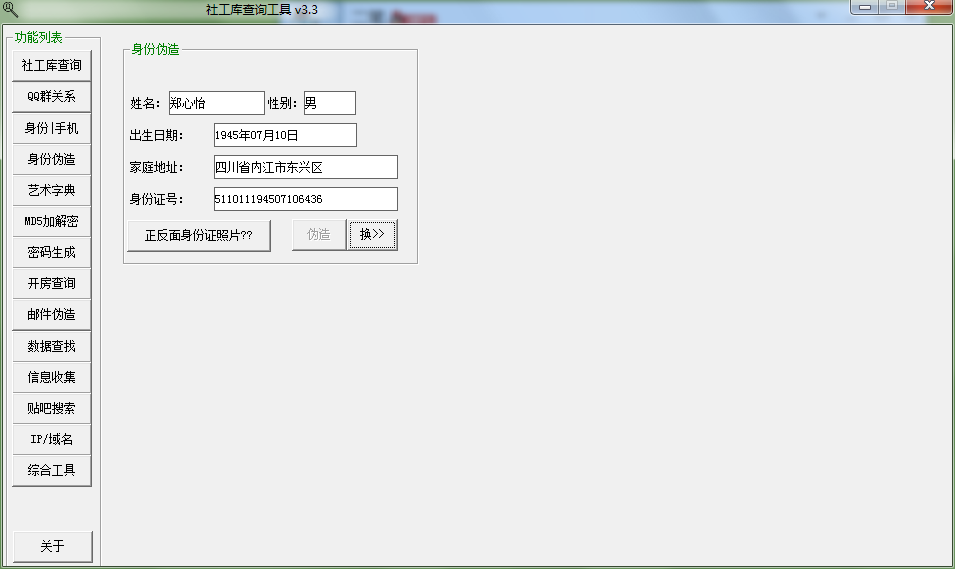 功能介绍: 社工库查询:查询互联网上被脱裤的泄密数据 影响巨大 QQ群关系:腾讯QQ系统设计不当 导致QQ群资料数据泄露 仅供查询前几年的QQ群关系数据 身份证与手机号:验证身份证信息 地址 性别 年龄及手机号归属地 身份伪造:随机性伪造身份证号码信息 艺术字典:通过社会工程学技术来收集目标信息生成相关字典 用于爆破目标账号密码弱口令 MD5加解密:MD5是一种不可逆的加密算法,通过与数据库对比即可解密 密码生成:由字母 数字 自定字符 混搭生成的随机密码 使得被爆破难度大大增加 开房查询:之前知名酒店泄露大概2000万的数据信息 邮件伪造:提供任意发件人发送Email邮件功能,伪造发件人发送邮件发送可以通过填写收件人、发件人、邮件主题、邮件内容! 数据查找:也就是本地社工库 搜索计算机内响应的字符 而且多线程搜索速度比较快 信息收集:也就是人肉 一个人在网络上活动 避免不了会让搜索记录痕迹下来 贴吧搜索:其实也就是高级搜索页面 市面上的工具就是用高级搜索工具来查看隐藏用户发帖信息 IP/域名:详细了提供了IP 域名 归属地 whois 子域名 同服域名 dns 备案 机房位置