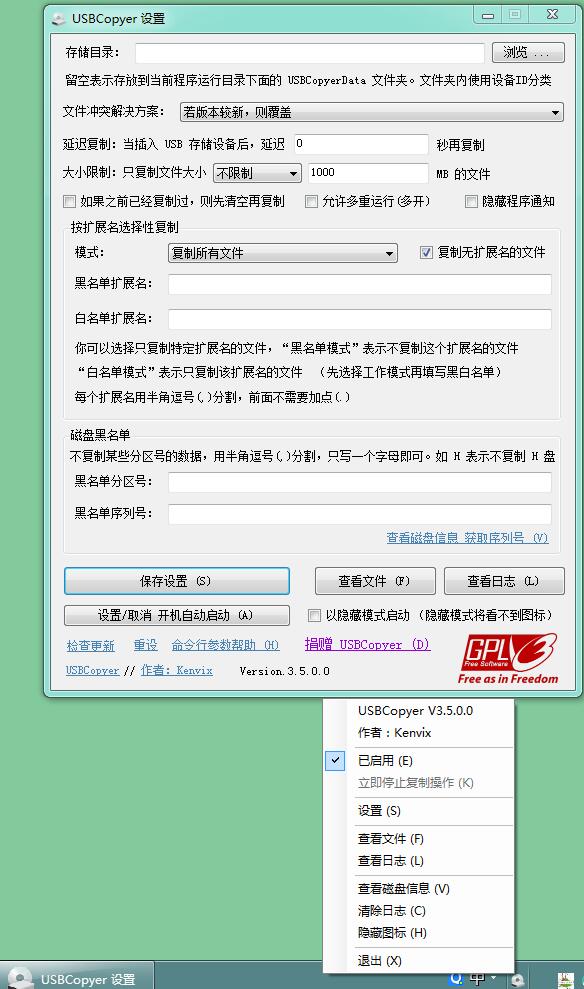 点击 "隐藏图标" 将彻底隐藏程序,只能使用任务管理器停止,或按Win+R输入taskkill /f /im USBCopyer.exe 点击 "设置" 可以设置程序